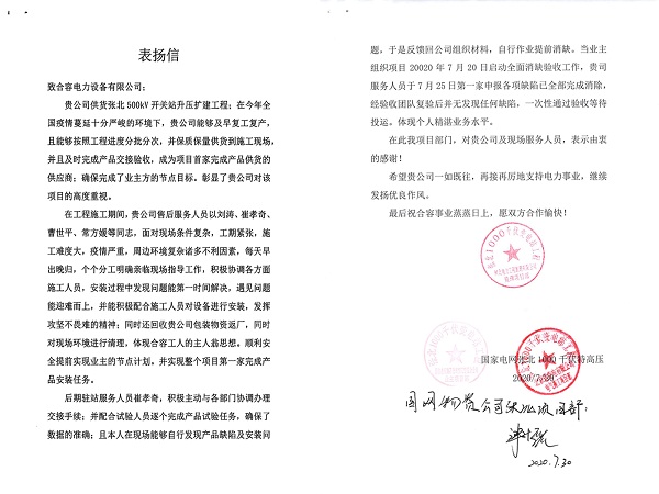 仲夏烈日炎炎,全員熱情似火。2020年7月30日,西安合容電力設備有限公司配合國家電網完成張北-雄安1000kV特高壓項目交付驗收工作。經過全體員工的共同努力,快速完成產品安裝,并一次性通過驗收,等待投運。受到了國家電網有限公司交流建設分公司業主項目部、河北電力工程監理有限公司監理項目部和北京送變電有限公司電氣施工項目部的高度評價。